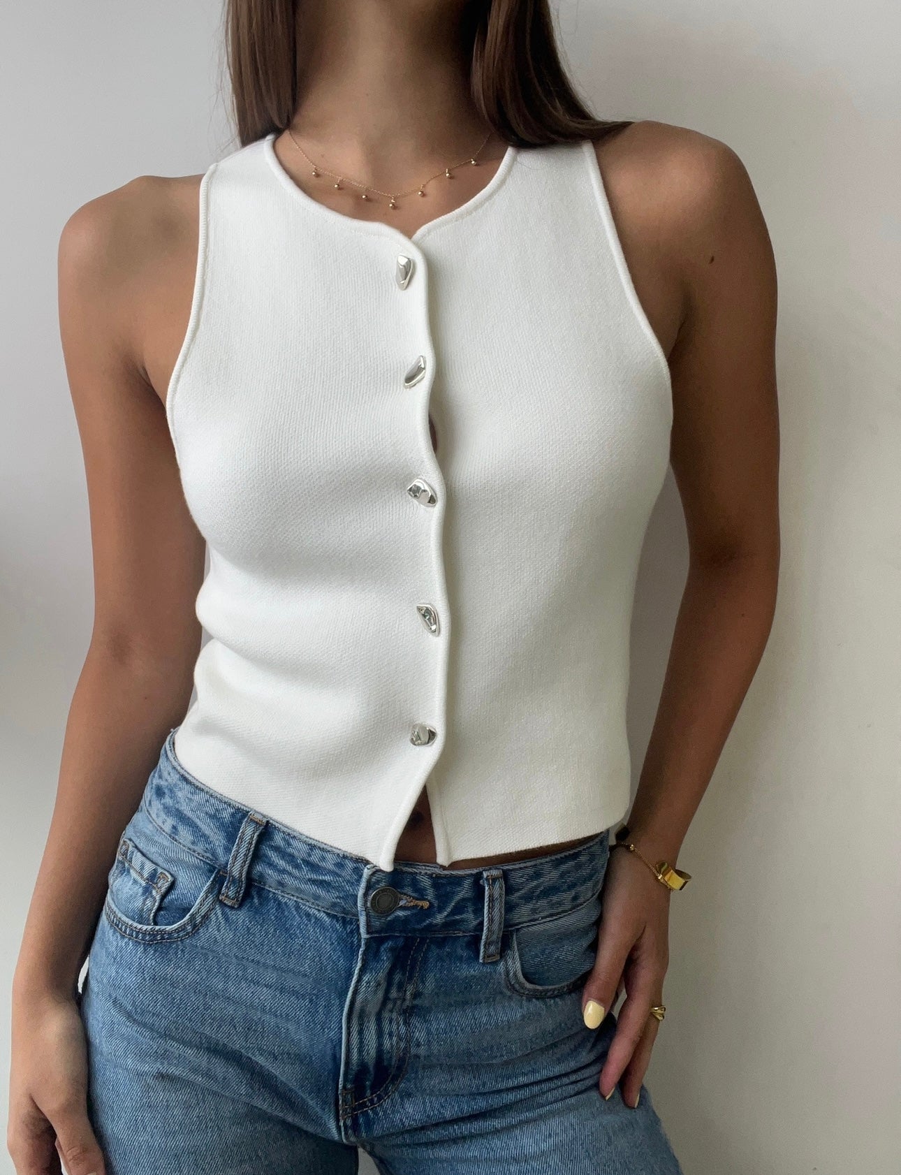 Top blanco sin mangas con botones metálicos al frente y corte ajustado.