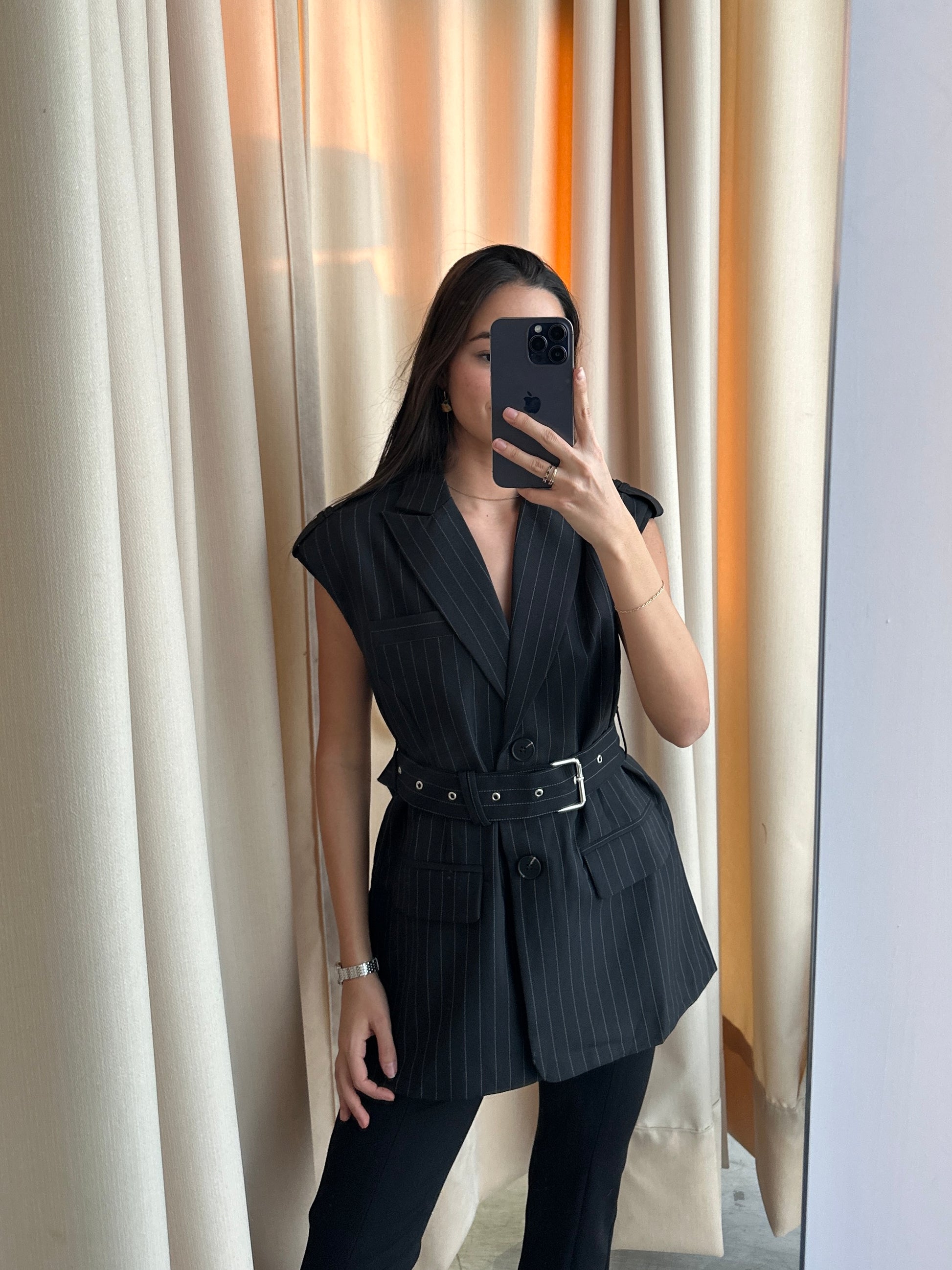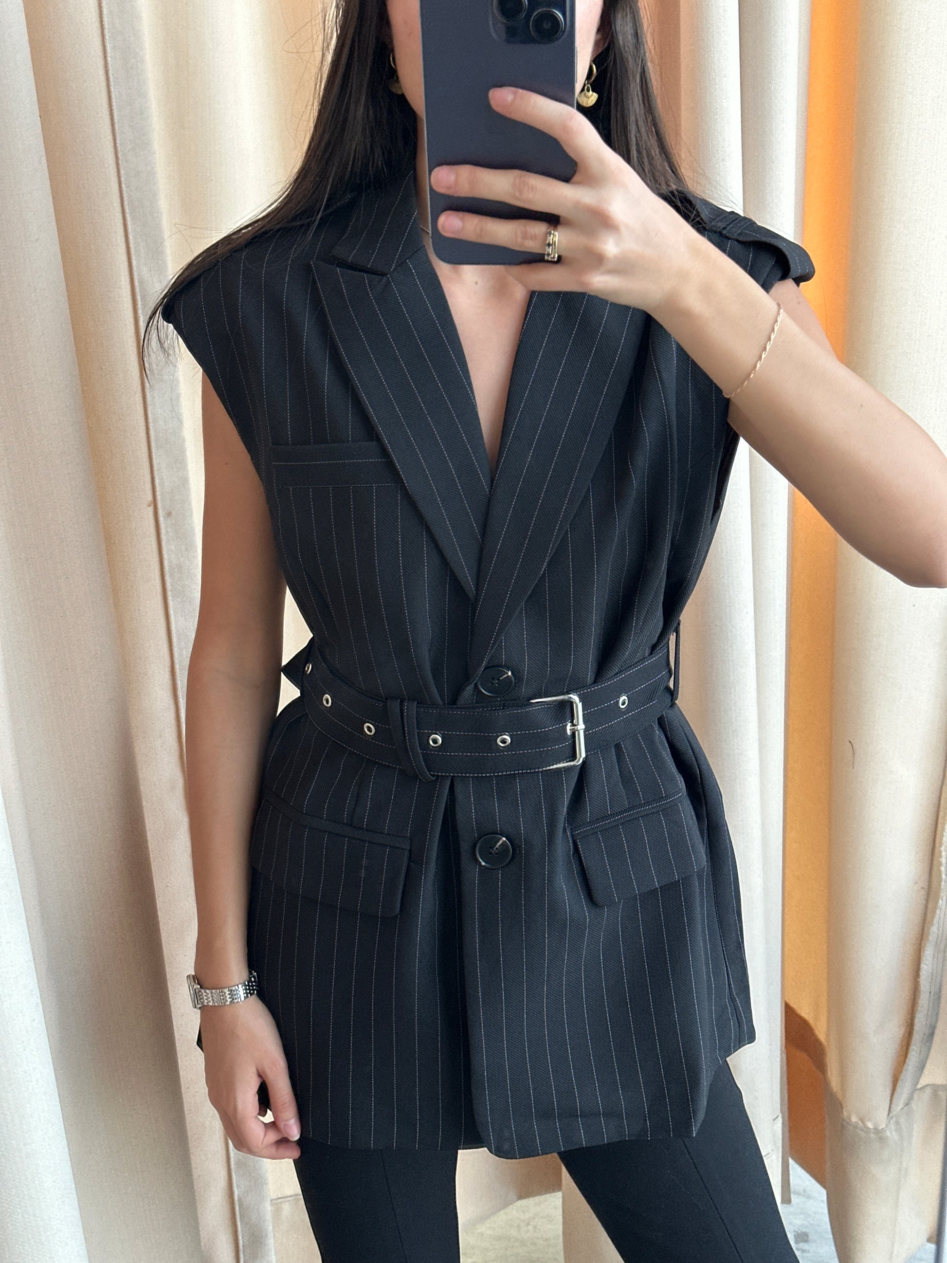 Chaleco sastre sin mangas en negro con delgadas líneas a rayas y cinturón removible para ajustar la cintura. COMPOSICIÓN: 95% POLYESTER, 5% SPANDEX