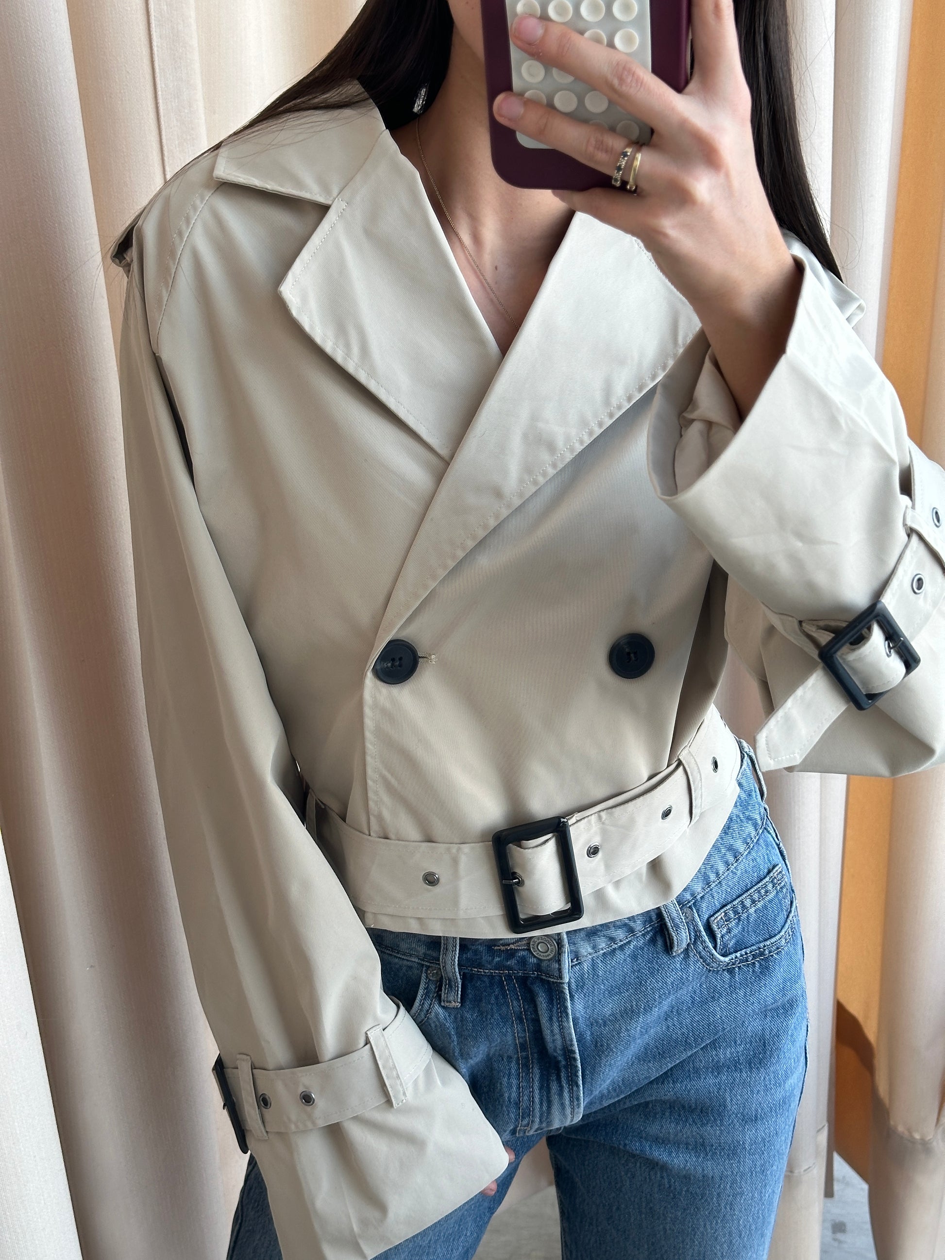 Gabardina corta en tono beige con diseño cruzado, cinturón ajustable y detalles en puños.