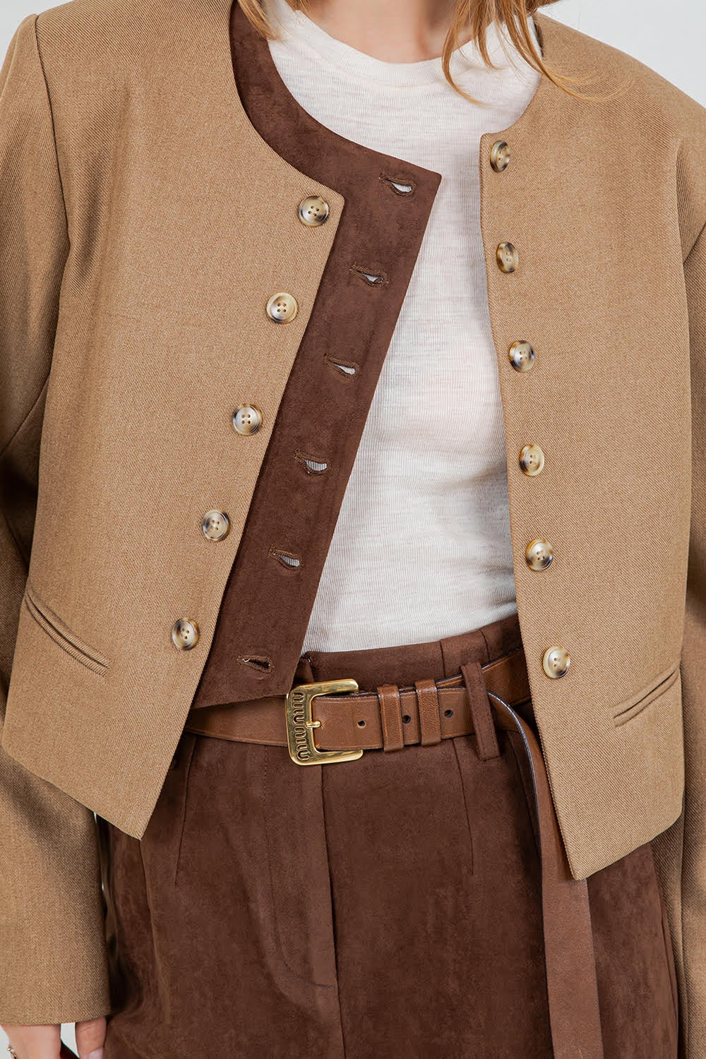 Set en tonos cafés y beige, con blazer corto y shorts tipo suede.