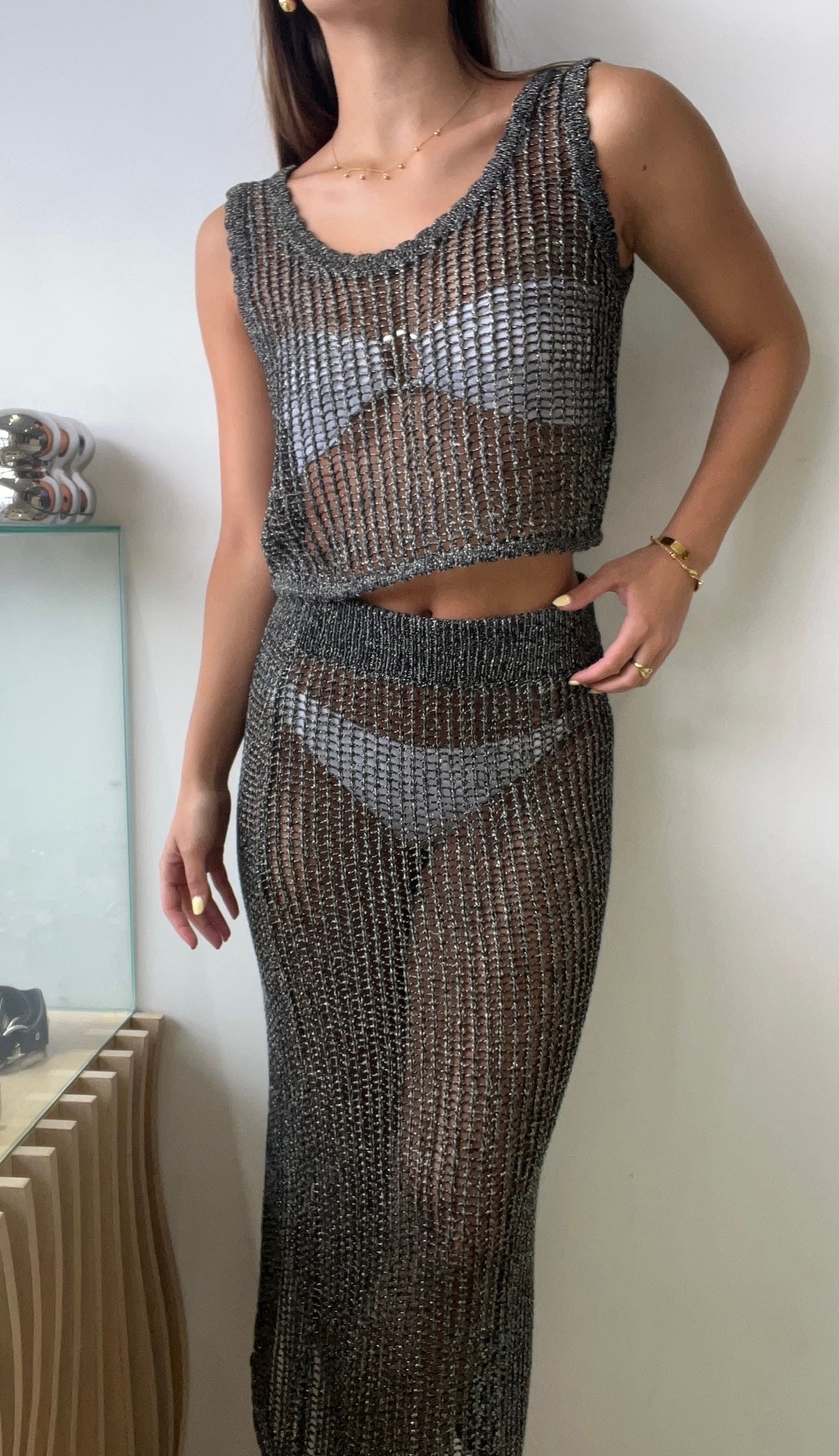 Set de playa tejido en color negro con hilos brillantes. Incluye top sin mangas y falda larga.