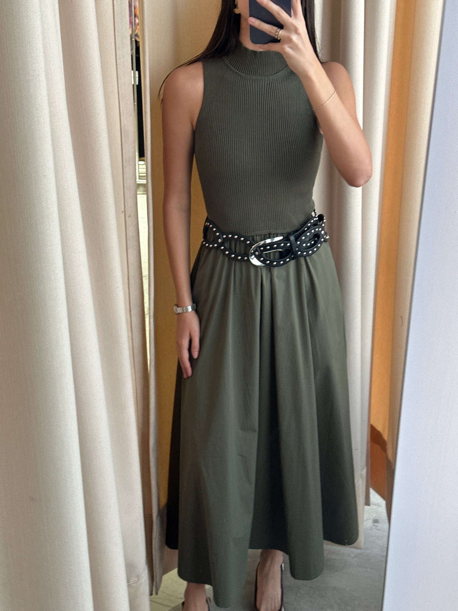 Vestido largo en tono verde oliva con cuello alto y acabado sin mangas.
