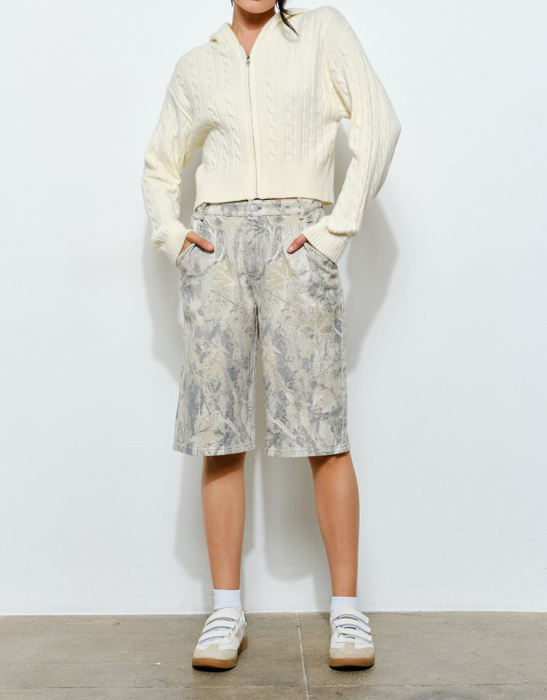 Suéter con capucha en tono crema, acabado con tejido tipo cable y cierre al frente. COMPOSICIÓN: 30% PBT, 18% ACRYLIC, 21% NYLON, 21% VISCOSA